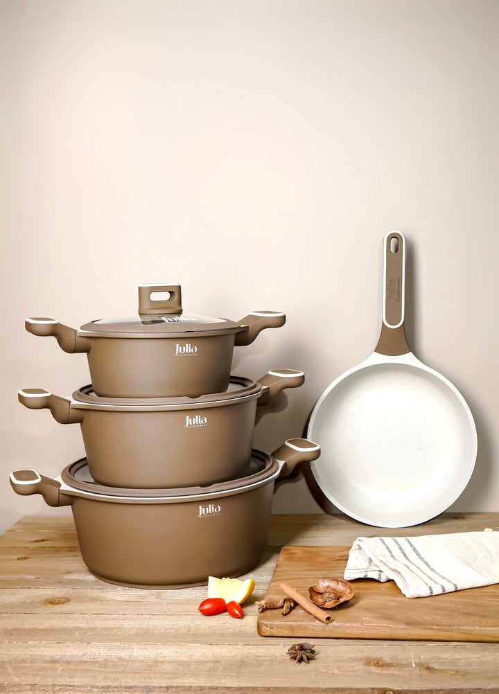 ميزات طناجر جوليا: 1. تصميم عصري وجذاب تتوفر بألوان متعددة مثل الأسود، الرمادي، البيج، والأخضر، مما يتيح تنسيقها بسهولة مع ديكور المطبخ. 2. مادة التصنيع مصنوعة من مواد عالية الجودة مثل...